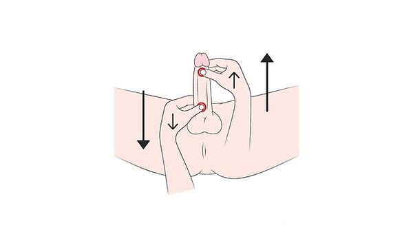 Comme sur le dessin 8, tenez le lingam avec vos deux mains : placez une main à la base et l’autre à l’extrémité, juste sous le gland. D'abord avec le puce de la main supérieure massez doucement le frein du pénis. Ensuite, commencez à effectuer un mouvement de rotation douce et opposée entre les deux mains, comme si vous ouvriez lentement une bouteille. La main du bas tourne légèrement dans une direction tandis que celle du haut tourne dans l’autre. Gardez un rythme lent et souple, sans tirer ni serrer, en maintenant une pression légère et fluide.
